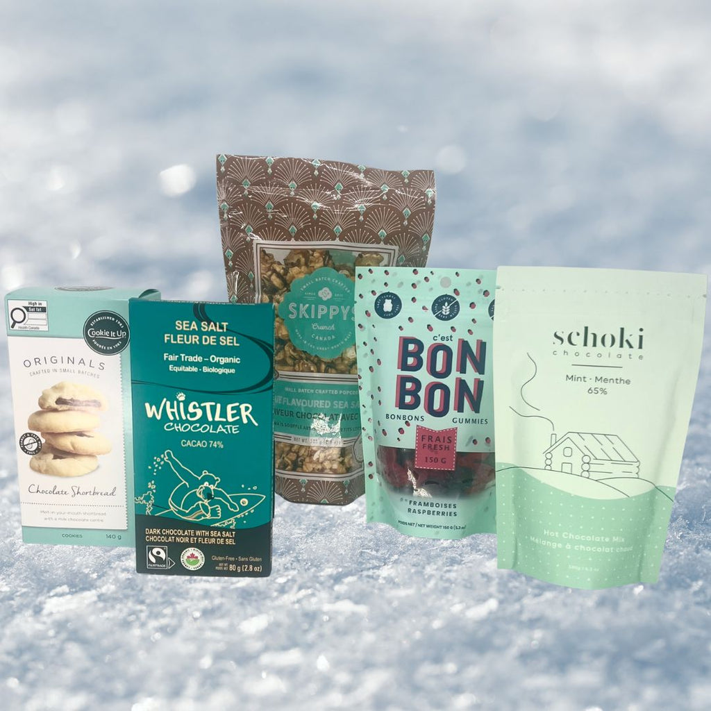 The Green Lake Box is an ideal treat for a winter weekend getaway in Whistler. Indulge in buttery shortbread cookies complemented by rich, creamy mint hot chocolate. Enhance the experience with a selection of popcorn, chocolate, and delightful gummies, all sourced from Canadian vendors.